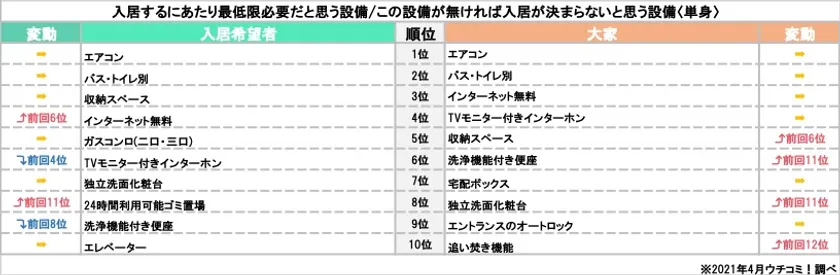 「入居する/入居者募集するにあたり、最低限必要だと思う設備ランキング」(単身)
