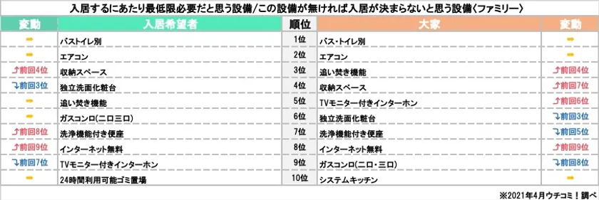 大家さん、入居希望者に聞いた!2021年人気設備ランキング ファミリー向け「システムキッチン」が上位にランクイン ~コロナ禍による新たな生活スタイルが設備に影響~