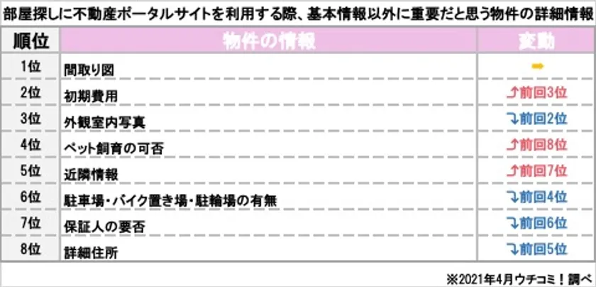 「部屋探しに不動産ポータルサイトを利用する際、基本情報以外に最も重要だと思う物件の詳細情報を教えてください」