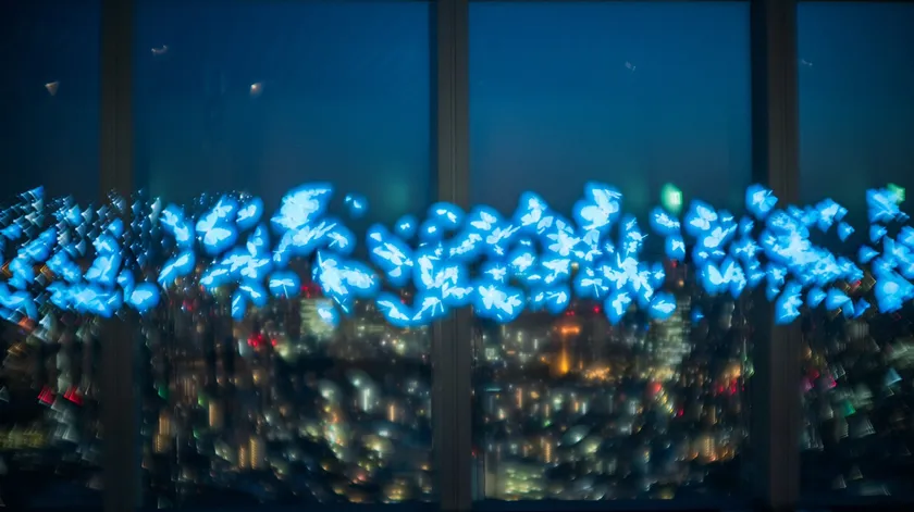 六本木ヒルズから見える地平線をトランスフォームする.空と大地の境界をなす線に光やイメージを書き加える.展望台というロケーションから見える,観念の境界線上に計算機と表示装置を用いて,「物化する自然」を描いていく.
