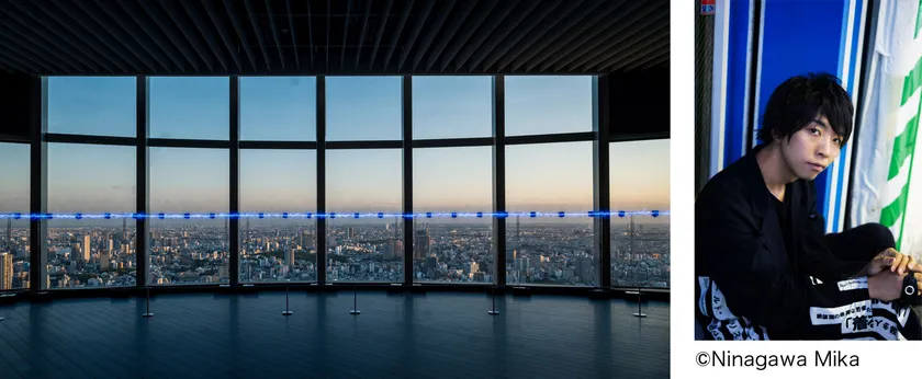 落合陽一の作品のテーマは物化や変換,映像と物質,計算機自然と質量への憧憬です.さまざまなメディア装置を使った表現を創る中でMATへの出展を毎年続けています.なかでもMATでは都市の空中風景というロケーションを活かした作品を作ろうと心がけていて,今回は六本木ヒルズの52階から見える地平線に,「デジタルで変化する地平線=物化する地平線」を上書きしたらどういう風景になるのだろうかと思いました.