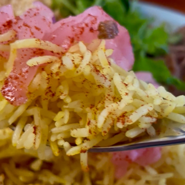 パスマティライス100%使用のダーメリックライスはコンソメ風味。