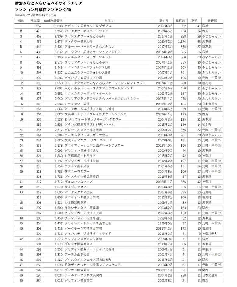 【みなとみらい&ベイエリア マンション坪単価ランキング50】