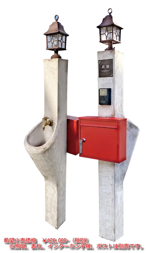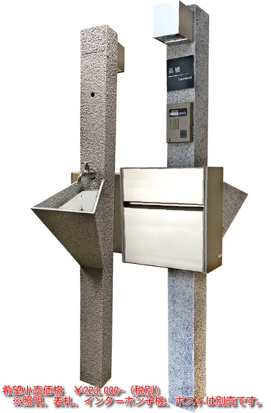 両商品ともに、手洗い場と柱が一体となった給排水一体型立水栓付機能門柱となっております。