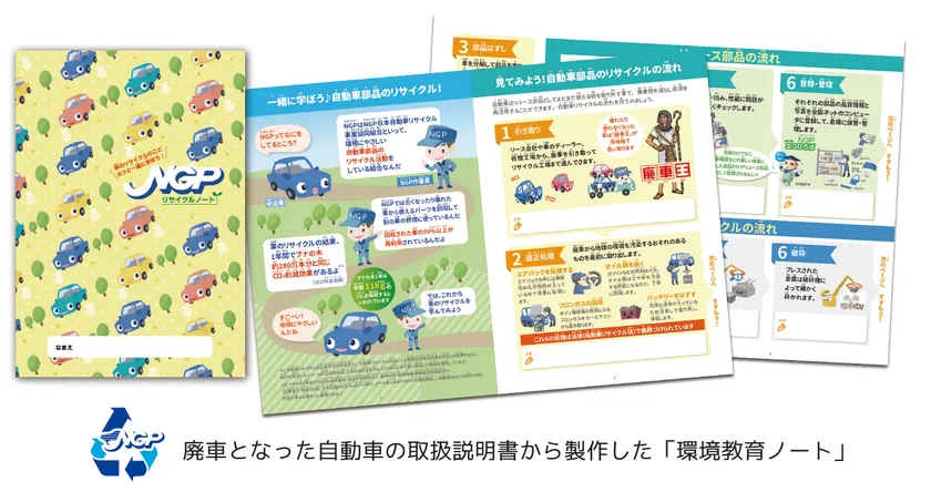 工場見学の際に事前に配布する「環境教育ノート」は、「NGPアップサイクルプロジェクト」(詳しくはこちら https://www.ngp.gr.jp/upcycle/ )で廃車になった自動車の取扱説明書を再生利用して製作したものです。これまで廃棄物となっていたものを再利用した「環境教育ノート」を使って工場見学を行うことで、自動車リサイクルの流れを学習するだけでなく、廃棄物の発生抑制や資源循環の大切さも学ぶことができます。