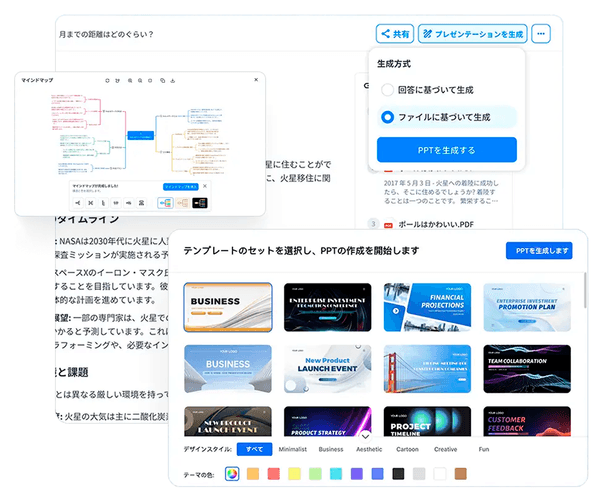 ・検索結果を基にスライド、マインドマップ、PDFなどをワンクリックで自動生成。数百種のテンプレートに対応