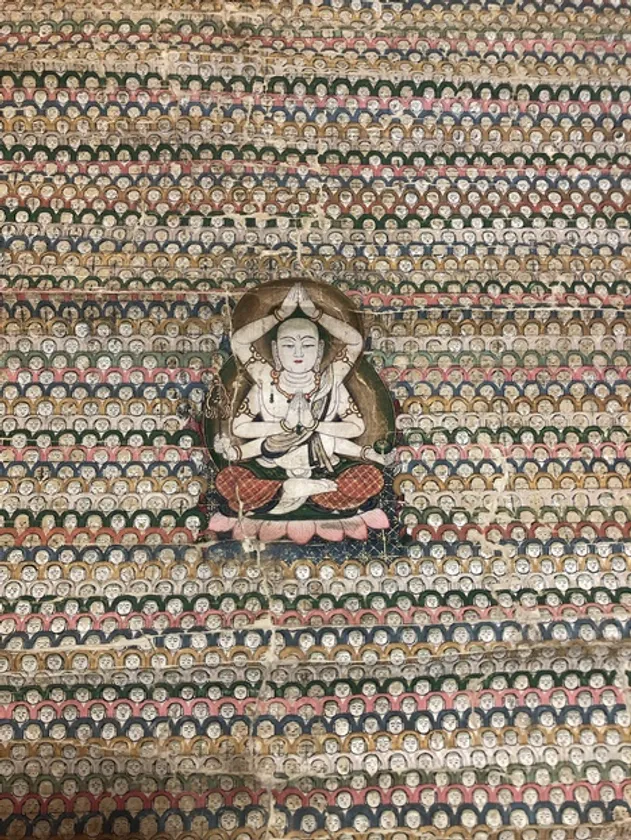 中心に描かれた「六本腕の地蔵菩薩」。地蔵菩薩がこのようなお姿で描かれた例が国内にほとんど存在しません。また周囲に小さな地蔵菩薩を1万2,000体も描くという構図はおそらく日本でこの曼荼羅一枚だけと思われます。