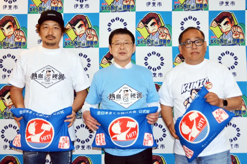 伊東市(庁舎:静岡県伊東市、市長:小野達也)は、アークシステムワークス株式会社(神奈川県横浜市、代表取締役:木戸岡 稔)が展開するゲームタイトル「熱血硬派くにおくんシリーズ」とコラボレーションしたまくら投げルール説明動画『熱湯!まくら投げin伊東市』を公開しました。併せて、伊東市小野市長とアークシステムワークス代表取締役の木戸岡社長、企画製作を手掛けたまくら投げプロモーションアドバイザーの株式会社FACT 三寺CEOとの対談動画も公開しています。