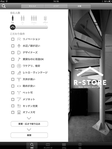 これまでの賃貸住宅検索アプリは部屋の数が多すぎて、検索結果の中から好みの部屋を探し出すのは大変でした。東京都だけでも募集中の賃貸住宅は71万室(アールストア調べ、2012年2月現在)にのぼりますが、デザイナーズやリノベーションされた部屋はその内のわずか0.1%、約7,000室程度と言われています。