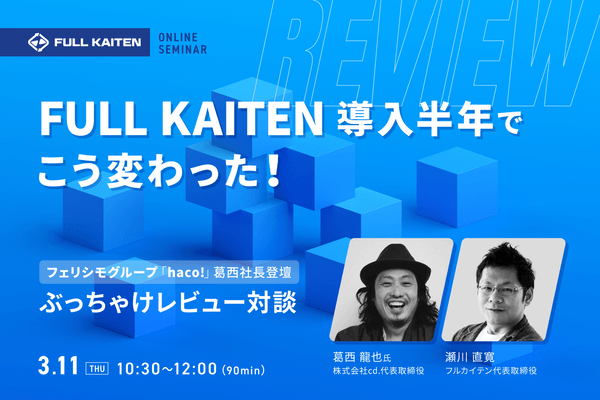 フルカイテン株式会社(本社・大阪市福島区、代表取締役・瀬川直寛)は2021年3月11日(木)、通販大手フェリシモグループのファッションECサイト「haco!(ハコ)」代表、葛西龍也氏を講師に招き、新型コロナウイルス危機下でも客単価を8%、売上高を25%向上させた背景や具体的手法について語るオンラインセミナーを開催します。haco! が在庫DXツール『FULL KAITEN』を導入後、わずか半年で目覚ましい成果を残した舞台裏を葛西氏があますところなく講演し、在庫問題をはじめとした経営課題をどのように解決していったのかについて瀬川とディスカッションを行います。