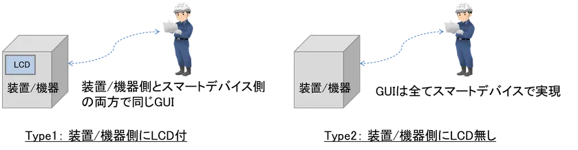 組込機器とスマートデバイスをWi-Fi、Bluetoothなどでつなぎ、組込機器のGUIをスマートデバイス上で表示したり操作したりすることができます。下図Type2の方式(装置や機器をLCDレスにして作業者が必要な時にスマートデバイスを用いてGUI表示や操作を行う)により、対象機器装置や機器のコスト削減を実現することが可能です。