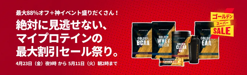 健康・美容・ライフスタイルに特化したTHE HUT GROUPが運営するヨーロッパNo.1スポーツ栄養ブランド「マイプロテイン」は、在宅を推奨されるゴールデンウィークにあわせて4月23日(金)夜9時から5月11日(火)朝2時までの期間限定で、最大割引セール祭り「ゴールデンスーパーSALE」を実施いたします。