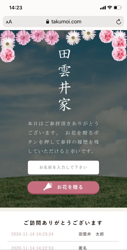 ご家族のページのお花を贈るボタンを押すとページ上にお花が咲きます。