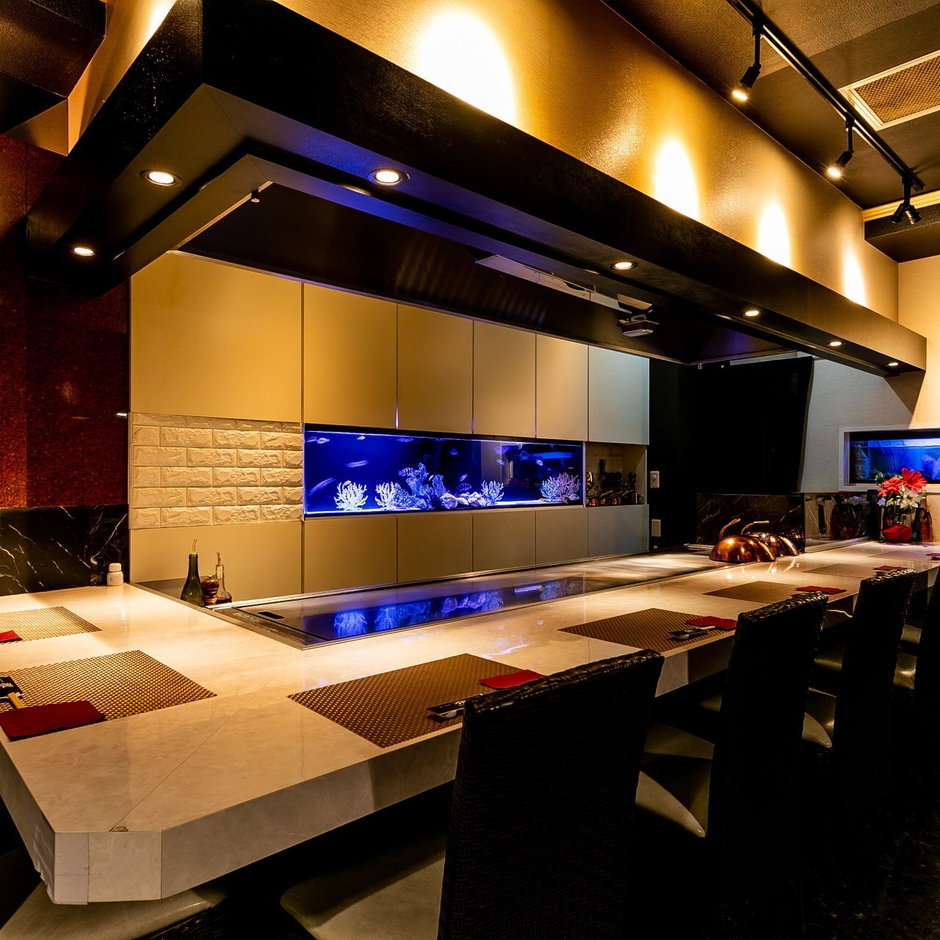 鉄板焼きのパフォーマンスを楽しむならカウンター席、ゆったり寛ぎながら食事をしたいときはテーブル席がおすすめです。