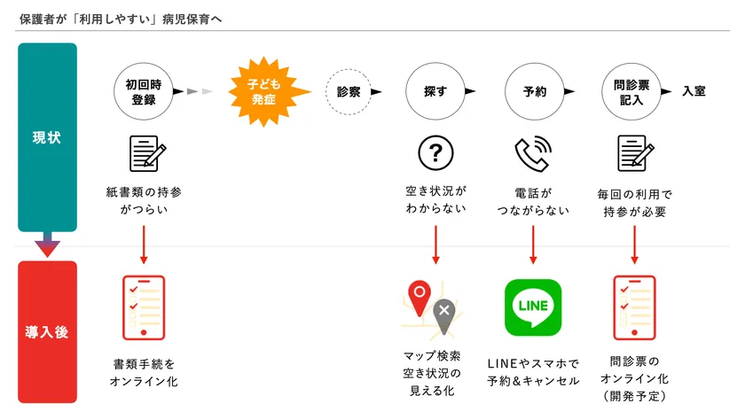 保護者はいつでも簡単にLINEやWebから病児保育を検索、予約が可能。病児・病後児保育室のスタッフにとっては、煩雑な事務作業から解放され保育に集中できます。さらに導入自治体では、地域にあるすべての病児保育の情報を一元管理できるようになり、保護者のみならず、病児・病後児保育室、自治体が三方よしの形で病児保育事業を行えます。