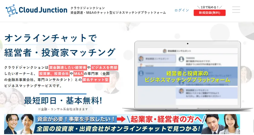 CloudJunctionは、コロナウイルスの影響等で資金繰りに困っている事業者や、自社のビジネスを譲渡したい経営者が、全国の金融系会社や専門コンサルタント、エンジェル投資家と匿名チャットでやり取りが可能なビジネスマッチングサービスです。