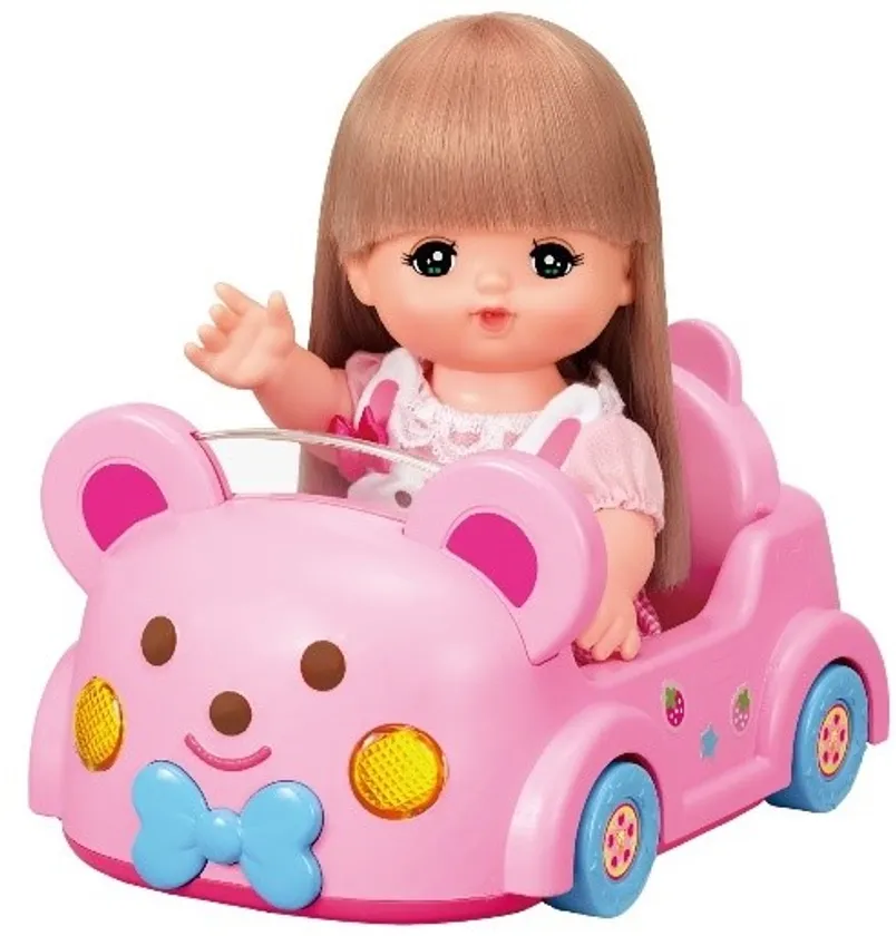 「ドライブしましょ♪くまさんカー」は、メルちゃんを乗せて手転がしで動かすことができます。トランクは開閉でき、セットのエコバッグを収納することができます。また、“おうだんほどうシート”もついているので、遊びながら交通ルールを学ぶことができます。