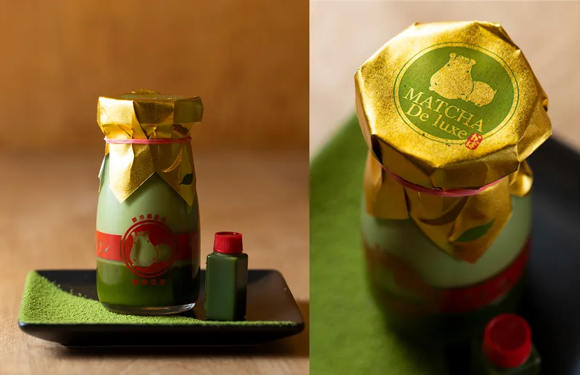 本山抹茶の上品な苦味のくず練りと、静岡県産の抹茶を使用したなめらかでまろやかな味わいのプリンを楽しめる、2層仕立ての抹茶プリン。本山抹茶を使用した特製抹茶ソースも付いており、3度の味変で本山抹茶の深みと上質な香り、他とは一線を画す美味しさをご堪能いただけます。