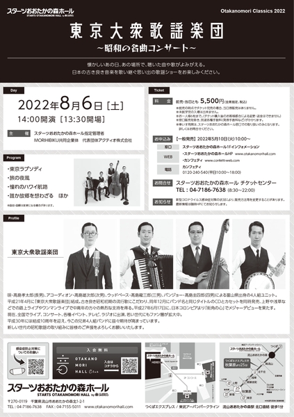 スターツおおたかの森ホール指定管理者MORIHIBIKU共同企業体 代表団体アクティオ株式会社主催『東京大衆歌謡楽団~昭和の名曲コンサート~』が2022年8月6日(土)にスターツおおたかの森ホール(千葉県流山市)にて開催されます。チケットはカンフェティ(運営:ロングランプランニング株式会社、東京都新宿区、代表取締役:榑松 大剛)にて5月10日(火)10:00より発売開始です。