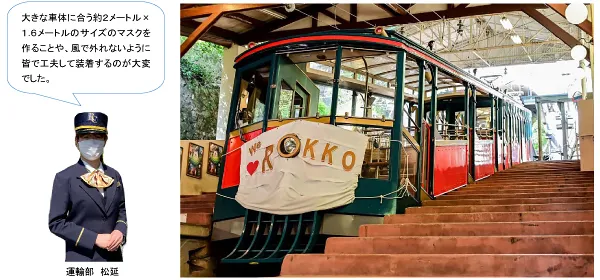 六甲山観光株式会社(本社:神戸市 社長:宮西幸治 阪神電気鉄道株式会社100%出資)では、2021年4月23日(金)から六甲ケーブルの車体にマスクを着用し、運行しております。これは、新型コロナウイルス感染拡大を機に、弊社社員から出たアイデアをきっかけに実現しました。六甲ケーブルにご乗車いただく際はお客様にもマスク着用をお願いしていますが、今回のこのような事態が一刻も早く収束することを願って実施いたします。
