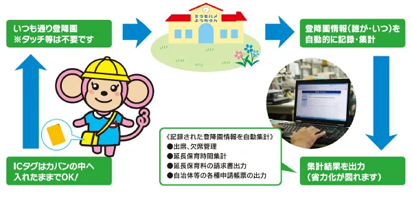 門への機器設置、システムの導入により、園児の鞄等に入れたICタグの門通過情報を自動で読み取って、出欠管理や延長保育の時間管理等を自動で行います。