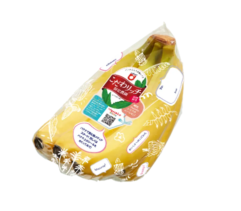 『こだわリッチ』バナナに貼られたシールをめくると現れるQRコードを読み込めば、購入者特典のエッセイが読める仕組みになっています。(シールは2重になっているので、パッケージの外からはQRコードは読み込めない仕組みになっています。)