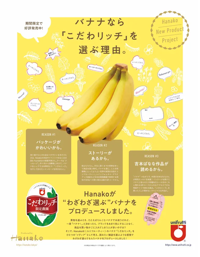 株式会社マガジンハウス(本社:東京都中央区、代表取締役社長:片桐隆雄)発行のライフスタイルマガジン『Hanako』(編集長:田島 朗)は、フルーツの輸入加工販売を行う株式会社 ユニフルーティー ジャパン(本社:東京都千代田区、代表取締役社長:ケナード・ウォング)と、同社の定番商品である『こだわリッチ』バナナのパッケージデザインとコンテンツを共同開発しました。4月12日頃より順次、コラボレーションパッケージに切り替わっており、6月末までの期間限定で販売されます。