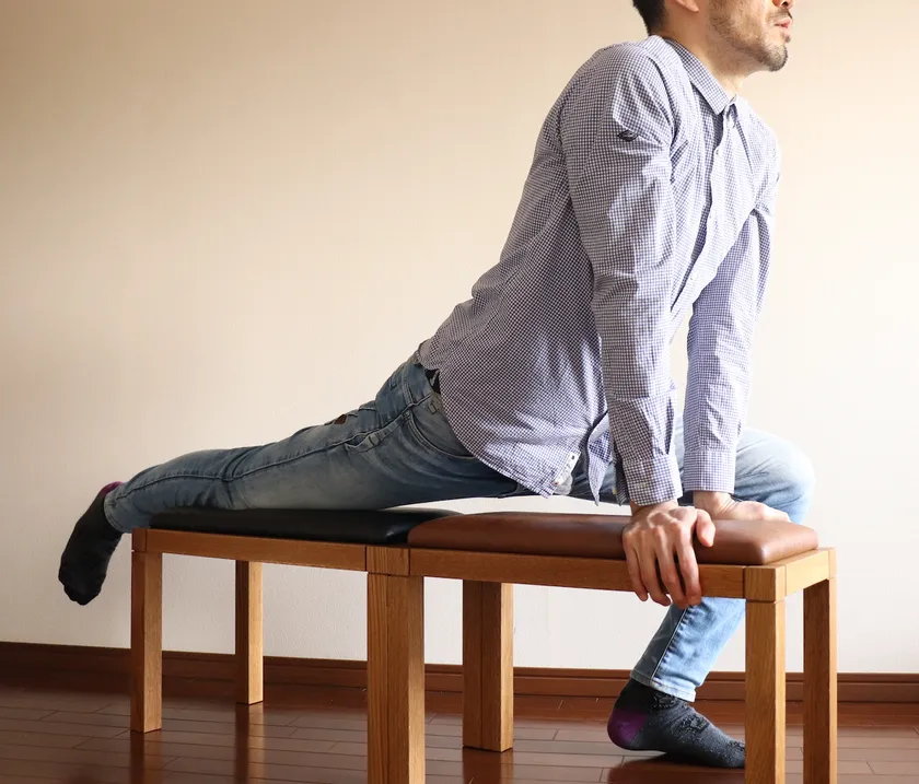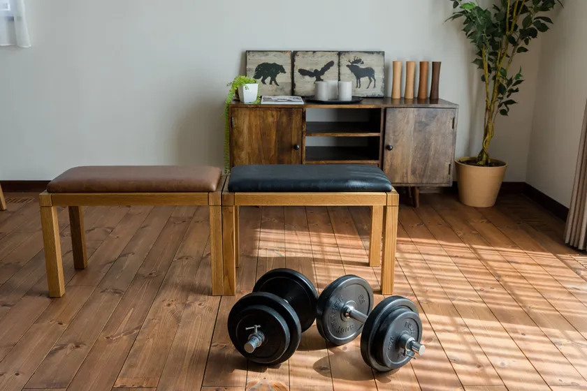 木製家具の椅子またはベンチとしてシンプルで洗練され、置く場所を選ばないデザインに「トレーニングに耐えられる強度」、「トレーニングを行いやすいサイズ」、「アルコール耐性のある素材」といったトレーニングベンチとしての仕様を兼ね備えています。