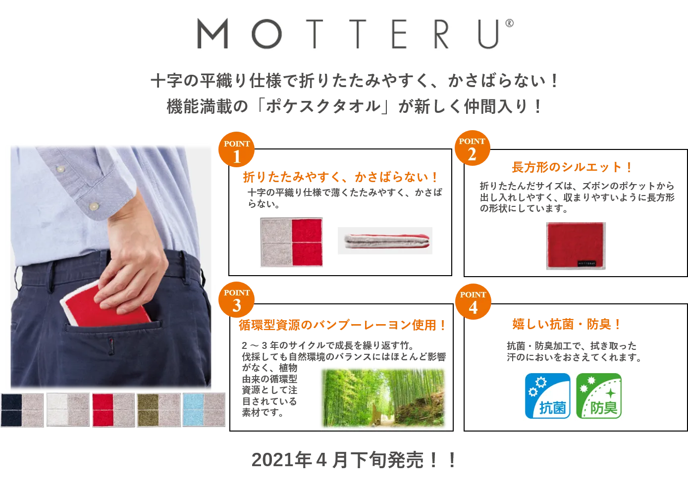 株式会社トレードワークス(本社:東京都渋谷区)は、エシカルブランド「MOTTERU(モッテル)」より「ポケスクタオル」を4月下旬より発売します。