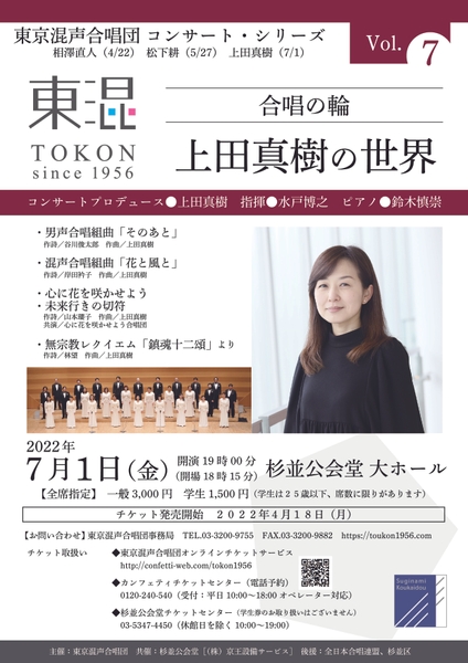東京混声合唱団コンサート・シリーズ『合唱の輪Vol.7 上田真樹の世界』が2022年7月1日(金)に杉並公会堂 大ホール(東京都杉並区)にて開催されます。チケットはカンフェティ(運営:ロングランプランニング株式会社、東京都新宿区、代表取締役:榑松 ⼤剛)にて4月18日(月)より発売開始です。