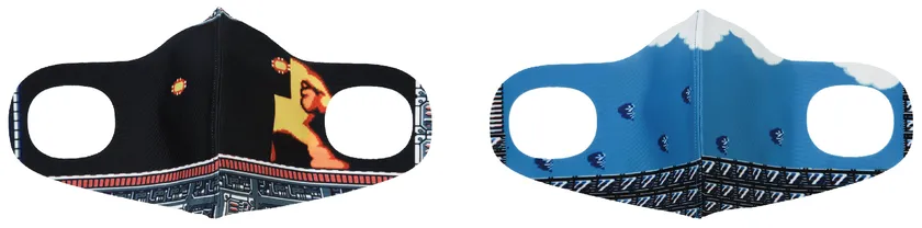 初代「ロックマン」の「ワイリーステージ」、「ロックマン2」の「エアーマンステージ」の背景を、8bit風のドット絵で完全再現してマスク全面にプリント。着用時でもマスク中央の縫製部分がきれいにつながるクオリティを実現しました。