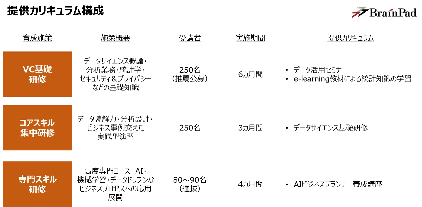 ブレインパッドが提供する本育成プログラムは、データ分析の入門編となる「VC基礎研修」に始まり、分析の基礎を学ぶ「コアスキル集中研修」、より高度な専門知識を学ぶ「専門スキル研修」の3つのプログラムを軸に構成されています。