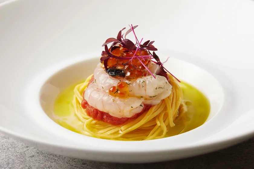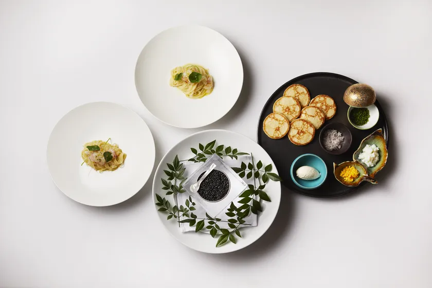 宮崎県産キャビア50gをさまざまなコンディメント(薬味)やブリニと一緒にお楽しみいただける贅沢なメニューです。シャンパンなどと一緒にお楽しみいただけば、優雅で贅沢な夏の夜をお過ごしいただけます。また、このキャビアを使って作る相模湾産ラングスティーヌと国産レモンの冷製カッペリーニも一緒にお召し上がりいただけます。
