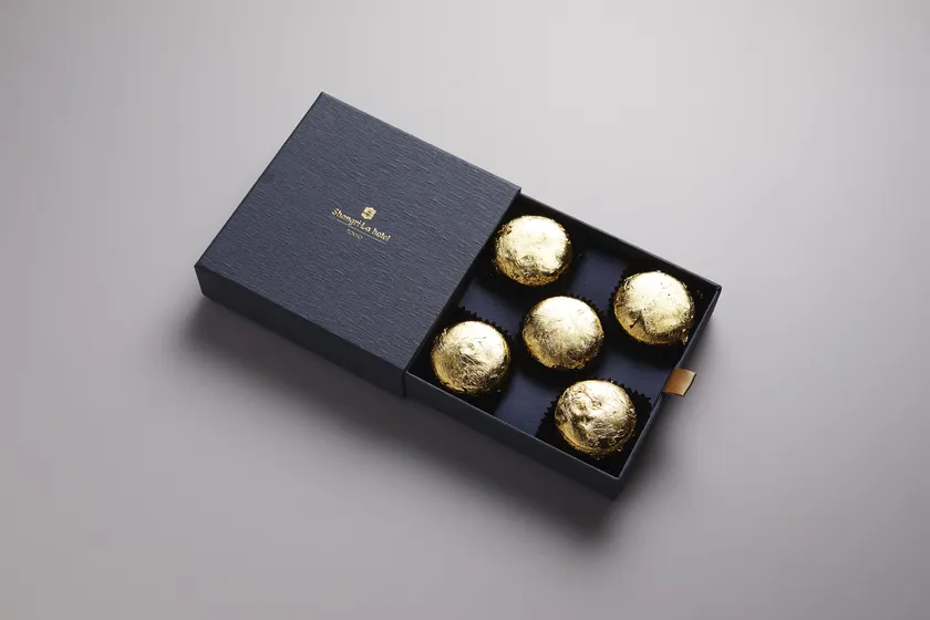 セレブレーション感溢れる金箔でデコレーションしたペストリーチーム特製のマカロンが登場します。シャングリ・ラ ホテルのオリジナルブレンド紅茶とミルクチョコレートのガナッシュをサンドした手土産にもお勧めのマカロンです。