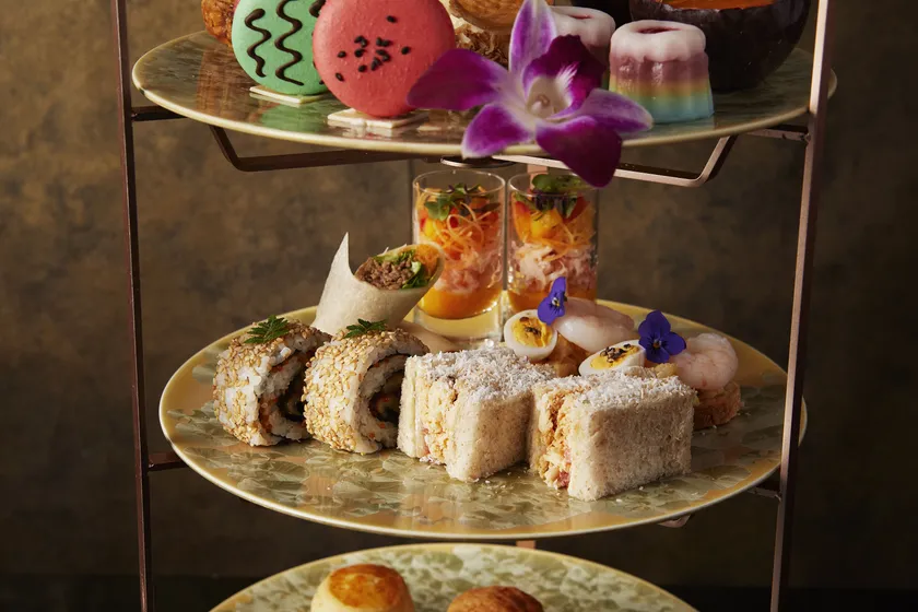 もちっとした食感のシンガポールのお菓子“ラピスサグ”やマレーシアでもよく食べられるパッションフルーツを使ったスイーツをはじめ、穴子を使ったロール寿司やズワイガニとタイ産マンゴーを合わせたサラダなどのセイボリーを、約20種類の紅茶やコーヒーとともにお楽しみください。