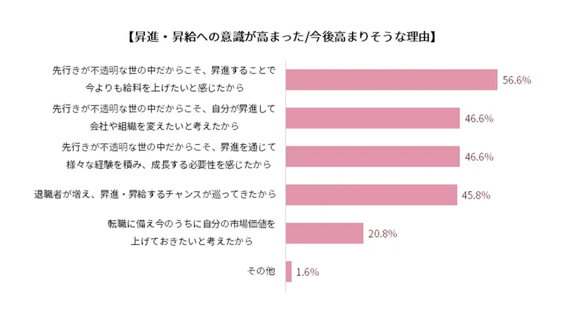 ・意欲向上の理由をみると、先行きが不透明な世の中だからこそ、「昇進することで今よりも給料を上げたいと感じたから」(56.6%)が最も高く、「自分が昇進して会社や組織を変えたいと考えたから」「昇進を通じて様々な経験を積み、成長する必要性を感じたから」が共に46.6%となりました。