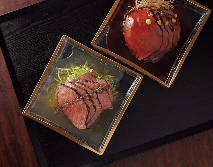 京都の洛中で三代続く名料亭「木乃婦」の素材と調理法にこだわったローストビーフセット。京都産のみを厳選した肉の旨味を引き立たせるため、あっさりとした味わいに仕上げた赤味噌と唐辛子、塩とすだちの2種のソースをお楽しみいただけます。