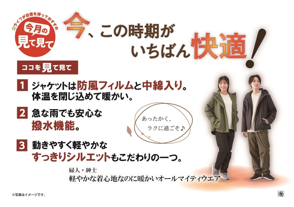 “おいしい” “ワクワク” “ハッピー” をお届けするライフコーポレーションは、「軽やかな着心地なのに暖かいオールマイティウェア」を、11月1日に近畿圏店舗で新発売いたしました。
