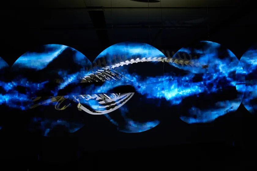 照明条件のデリケートな空間の中で試行錯誤を繰り返しました.立体的に配置された空中ディスプレイが美しく回転します.コビレゴンドウという質量のある自然と,3D Phantom(R)で描く質量のない自然を暗闇の中で組み合わせることで,非常にシャープで気持ちのいい表現ができたと思います.