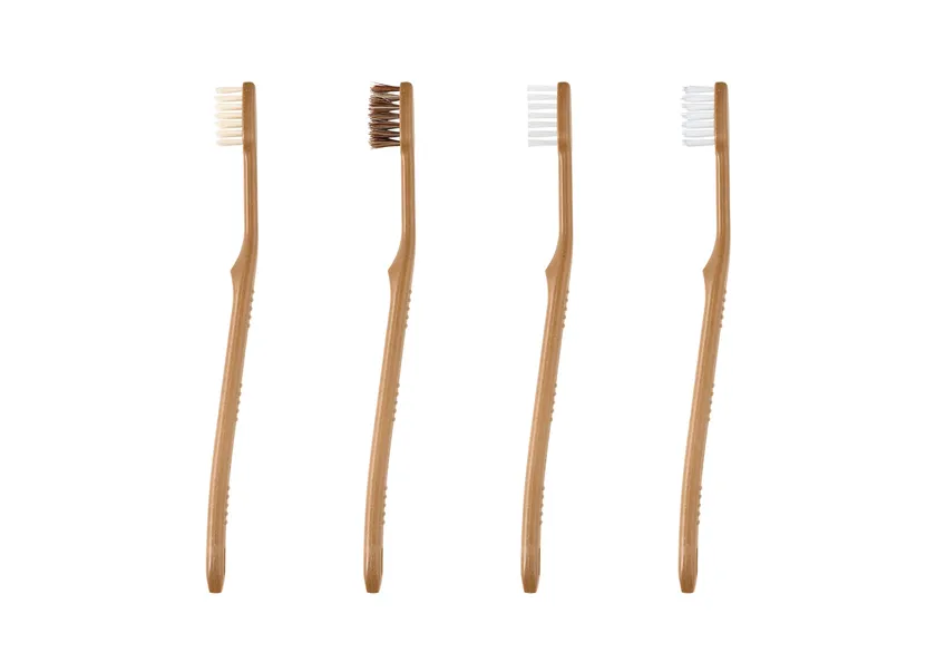 (1)豚毛:水を含むと程よい柔らかさになり、磨くと毛の方が磨耗していくので、歯のエナメル質や歯茎を傷つけにくい材質です。天然由来ならではのランダムな太さの毛で、歯の表面や歯間の汚れをしっかりと落としてくれます。