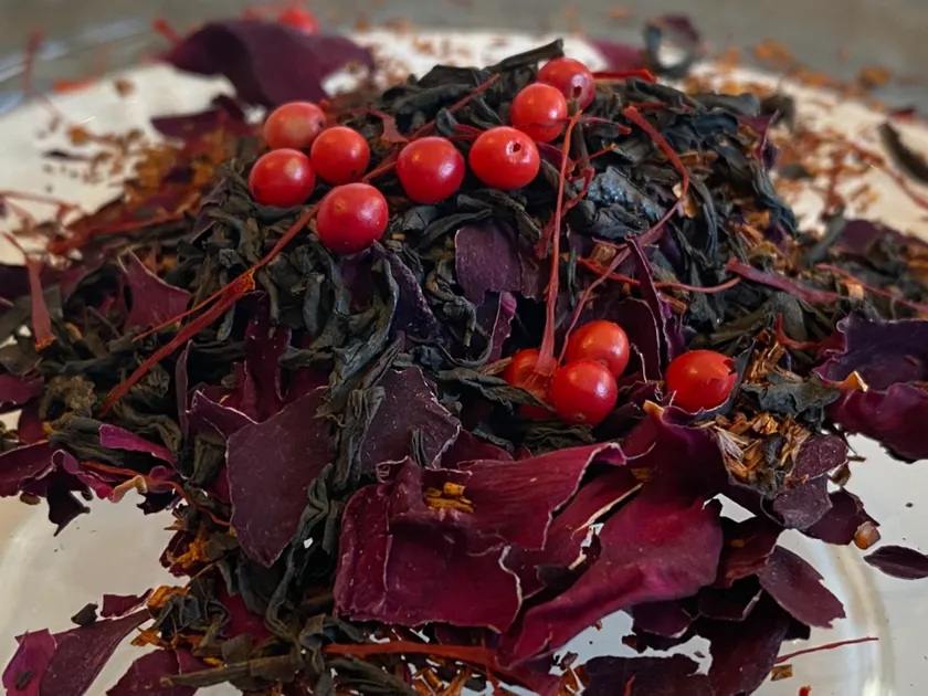 オーガニックで大切に育てられた大輪の真紅の食用薔薇さ姫を使用しています。サフラン、レッドルイボスと赤をキーワードに、Salonアルハルの館内をイメージしました。カフェインは、紅茶だけのベースより優しい仕上がりです。使用されている「サフラン」は、ヨーロッパの地中海沿岸を原産とするハーブの一種で、古代ギリシャでは、王族だけが使うことを許されるものだったといわれております。世界一希少なスパイスとも言われ、歴史的にも古く、古代ギリシャ・ローマ・エジプトの時代から、香辛料・染料・薬用として重宝されてきました。サフランの花は、年に1度しか咲かず、しかも48時間という短い開花時間。使用されるのは、1つの花から3本しかとれないめしべ部分のため栽培・収穫の手間が非常にかかります。サフランは、血行にも良いともいわれております。またマメ科の植物から作られたレッドルイボスは、ミネラル豊富で原産国の南アフリカでは「長寿の秘訣」の植物とも伝えられています。