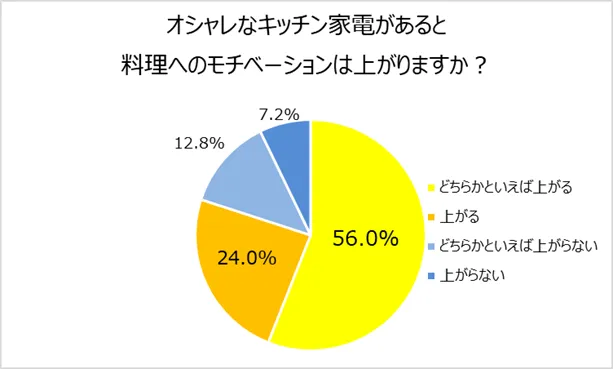 料理の手間を省き、レシピの幅を広げてくれるキッチン家電ですが、デザイン性が高いものであれば料理へのモチベーションはさらに上がるのかについて調査しました。その結果、8割の人が「上がる(24.0%)」「どちらかといえば上がる(56.0%)」と回答。オシャレなキッチン家電を使うことにより、気分良く料理ができるという人は多いようです。