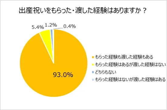 新型コロナの蔓延により、気軽に人と会えない日々が続いています。結婚や出産などの大切なお祝いも、なかなか直接伝えることができない現状があるのではないでしょうか。今回、出産祝いに関する調査を行ったところ、「出産祝いをもらった経験も渡した経験もある人」は93.0%にものぼることが明らかになりました。世間では、出産祝いを送り合うことが習慣になっていると分かります。
