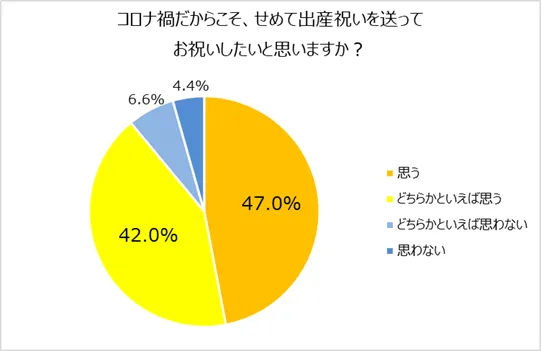 そこで、「コロナ禍だからこそ、せめて出産祝いを送って新生児の誕生をお祝いしたいと思うか」について質問をしました。その結果、約9割の人が「思う(47.0%)」「どちらかといえば思う(42.0%)」と回答。コロナ禍では、出産祝いを送って祝福の気持ちを伝えたいという思いがより一層高まっているようです。
