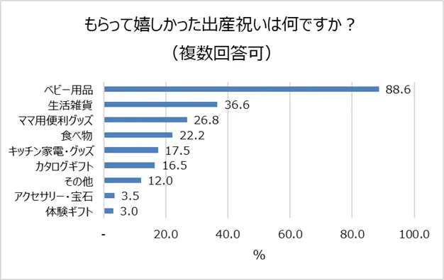 もらって嬉しかった出産祝い「ベビー用品(88.6%)」「生活雑貨(36.6%)」など