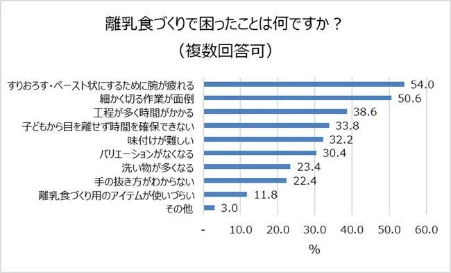 次に、出産祝いをもらう側の、新生児を持つ親が苦労する“離乳食づくり”についても調査を行いました。離乳食づくりで困ったことについて質問すると、「すりおろす・ペースト状にするために腕が疲れる(54.0%)」「細かく切る作業が面倒(50.6%)」という意見が多くあがりました。いずれも食べ物を噛む・飲み込むという機能が未発達の乳児にとって大事な工程ですが、とても大変な作業であるのも事実です。
