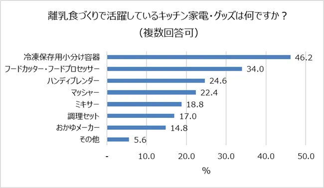 そこで、離乳食づくりで活躍しているキッチン家電・グッズについて伺うと、「冷凍保存用小分け容器(46.2%)」が最も多く、次いで「フードカッター・フードプロセッサー(34.0%)」「ハンディブレンダー(24.6%)」が支持されているとわかりました。