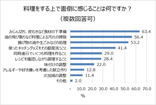 また、料理をする上で面倒だと思ってることについて伺いました。最も多かった意見は「みじん切り、皮むきなど食材の下準備(63.4%)」で、その後は「油の飛び散りなど料理による汚れの掃除(56.4%)」、「揚げ物の油や生ごみなどの処理(53.2%)」と続きました。どんな料理にも必須の工程である「食材の下準備」が、料理中に多くの女性を悩ませていることが分かりました。