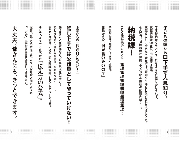 そんな著者が、帰郷して入った市役所で、「伝え方」を磨かなければ、公務員として生き残ることはできないと痛感し、伝え方に関する研究と実践を続けた結果、23の「伝え方の公式」を見つけました。