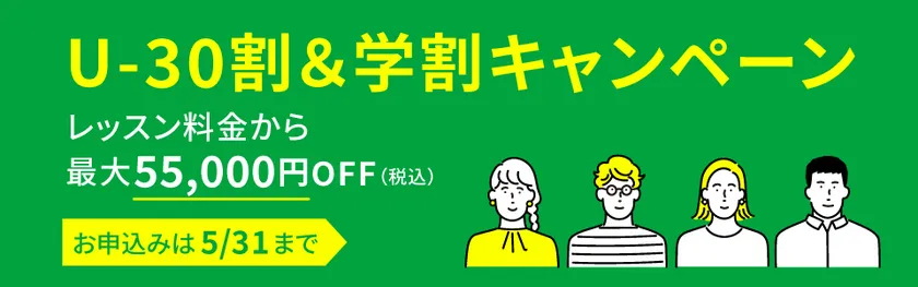期間中、30歳以下(社会人、中高生を含む学生)かつ60回以上のコースで新規ご入会された方を対象にコース料金から最大55,000円(税込)の割引